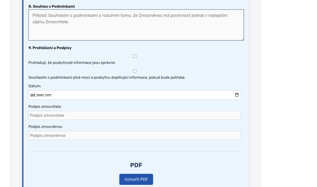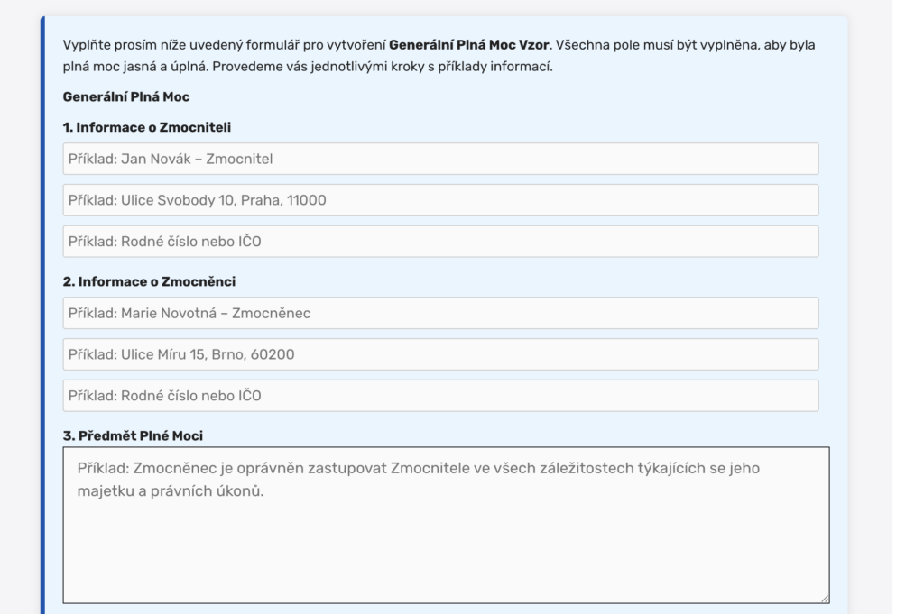 Dokument je nutné vyplnit kompletně před podpisem. Podepisování prázdných nebo neúplných formulářů (tzv. bianco plných mocí) představuje významné riziko zneužití.